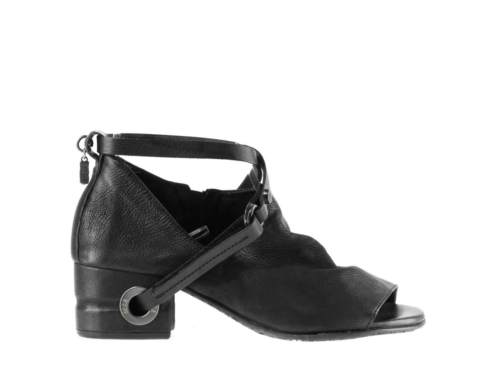 Smart sandal fra Airstep i sort skind med asymmetrisk look og tynd ankelrem der går igennem hælen. Skindforet og blødt polstret i indersål. Blokhæl i læderfiner på 5 cm. Lædersåler med stødabsorberende gummi. Rummelig i str.