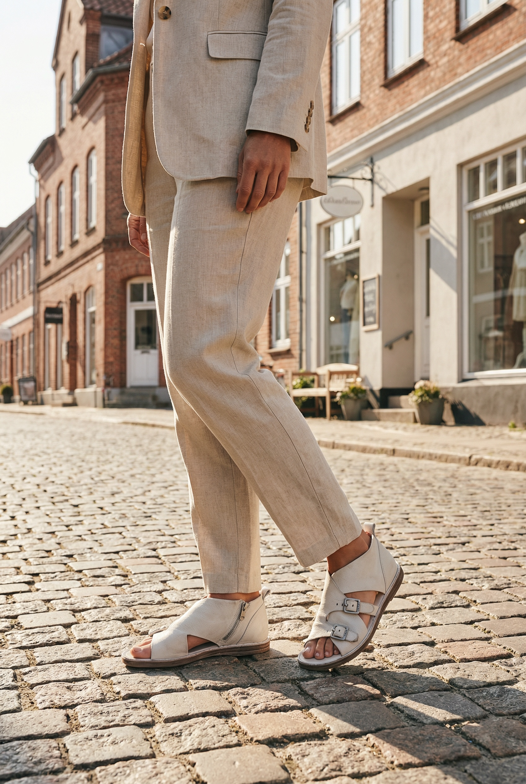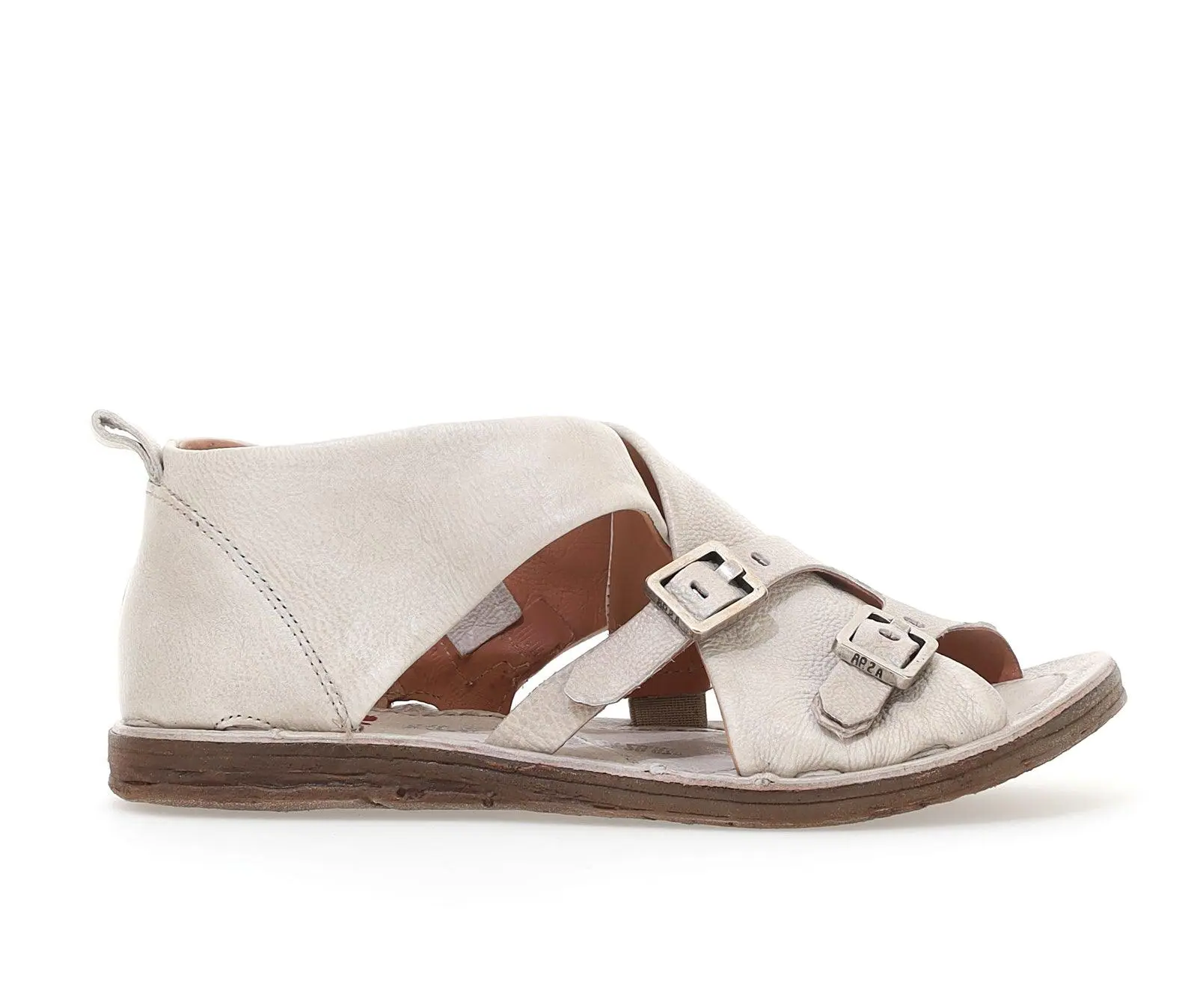 Sandal fra italienske Airstep/AS.98 i en rustik råhvid skind. Sandalen har brede remme så den slutter godt til foden og de tynde remme kan reguleres for et perfekt fit. Skindforet og med blødt polstret indersål. Stødabsorberende såler i naturgummi.