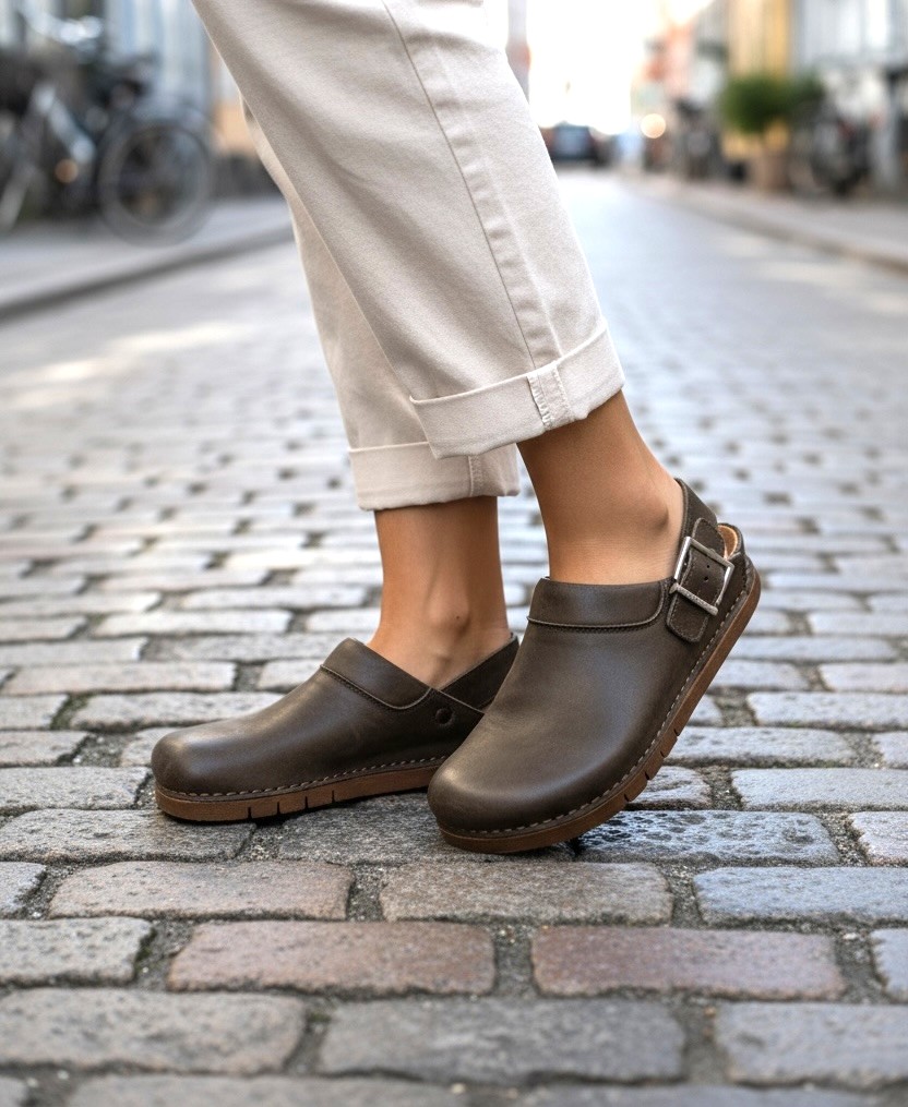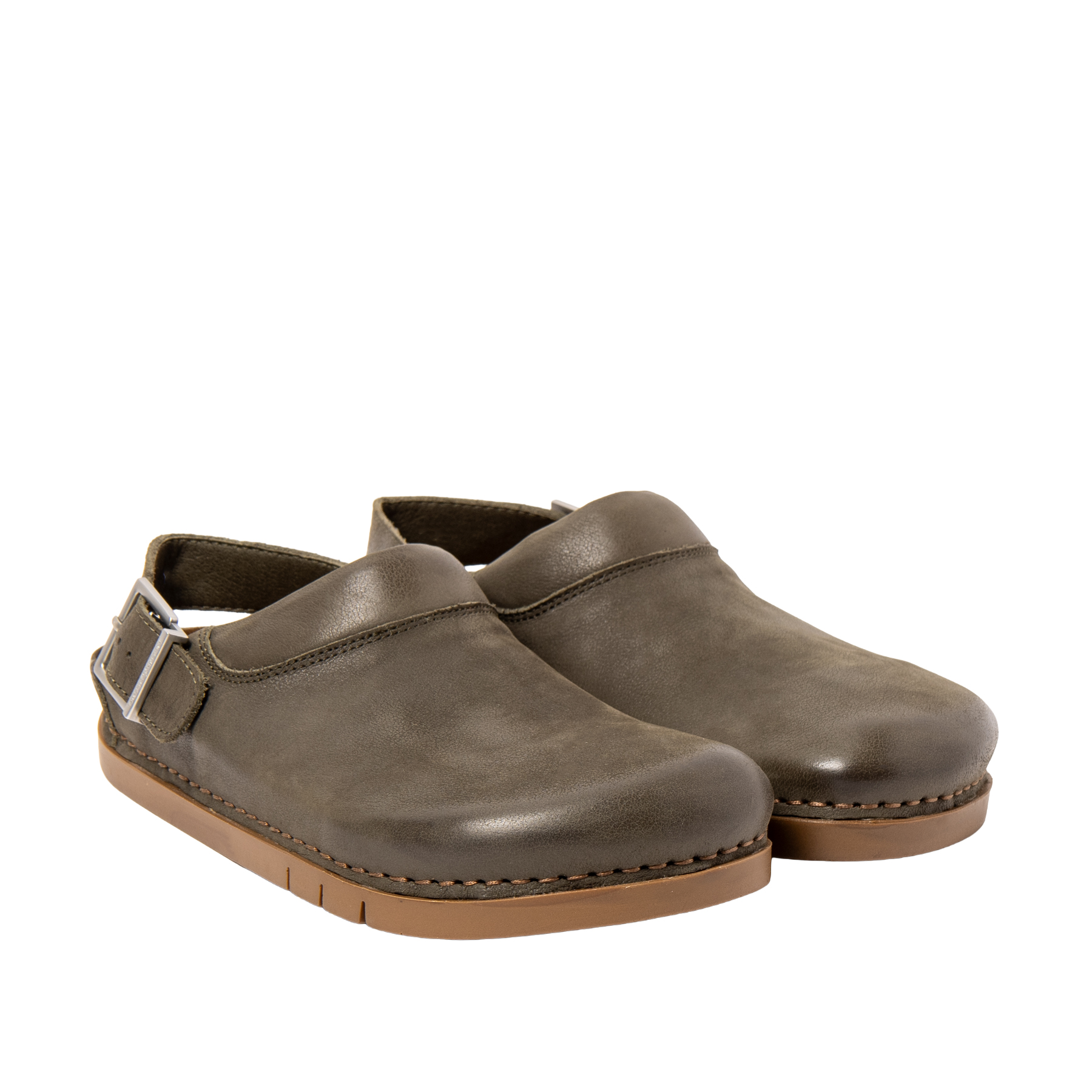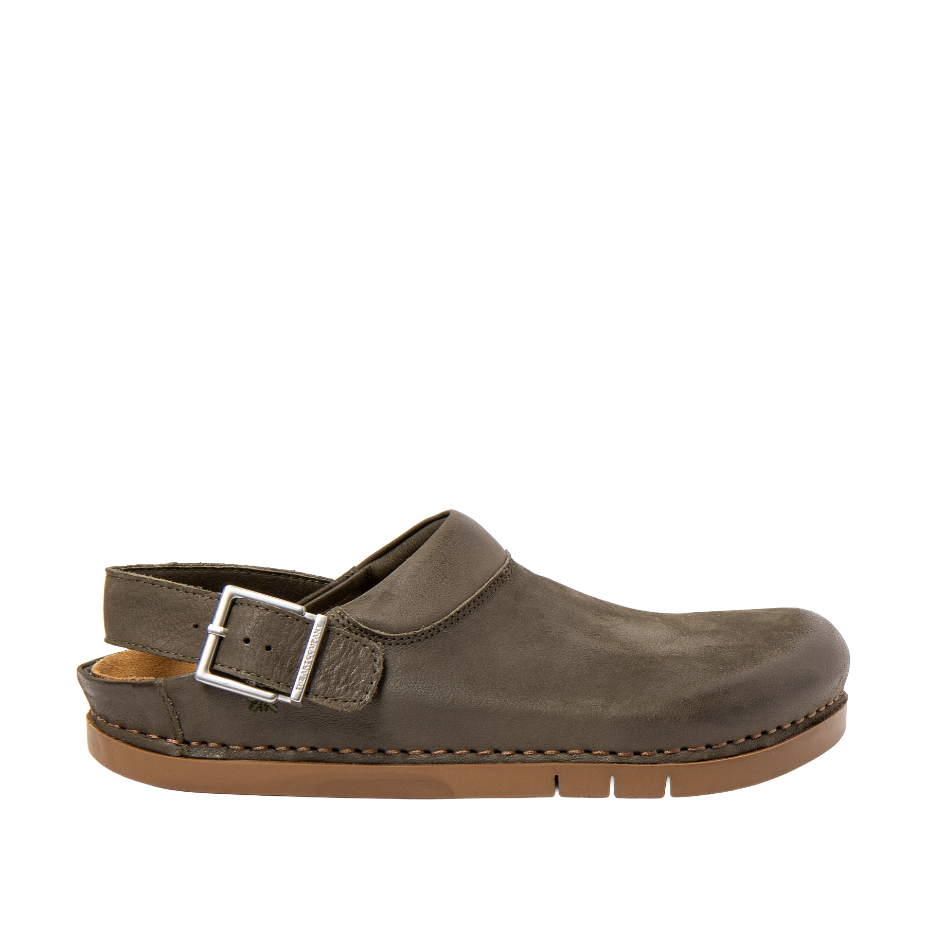 Flad sandal i khaki glat skind fra Art company med lukket front og regulerbar hælrem. Sål i stødabsorberende gummi. En praktisk sandal til arbejde og fritid med et cool og casual look. Normal i str.