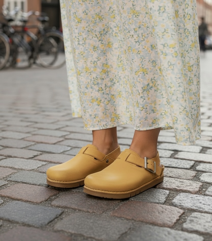 Flad sandal i en flot sol-gul farve fra Art company med lukket front og regulerbar hælrem. Sål i stødabsorberende gummi. En praktisk sandal til arbejde og fritid med et cool og casual look. Normal i str.