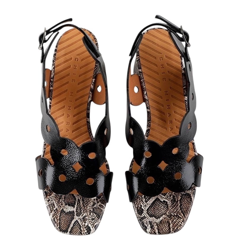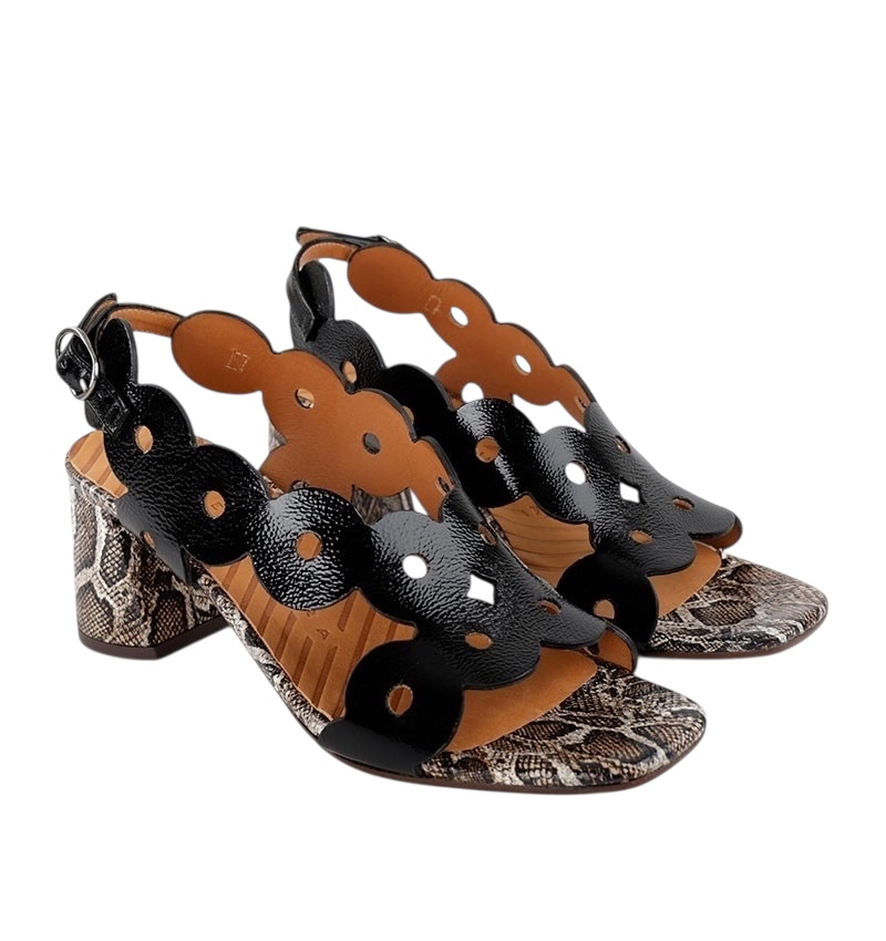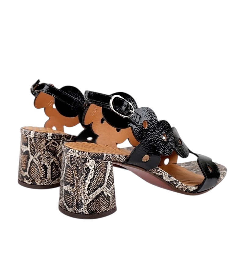 Chie Mihara - Sandal i sort lak og print på hæl - Ryed