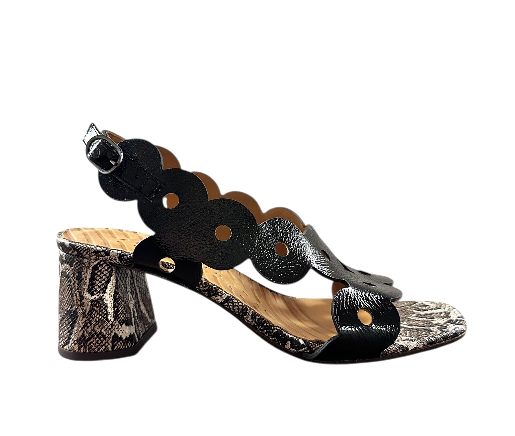 Sandal fra Chie Mihara i sort lak med mønster og moderat hæl i snake på 5 cm. Skindforet og lædersåler med gummi under forfoden. Normal i str.