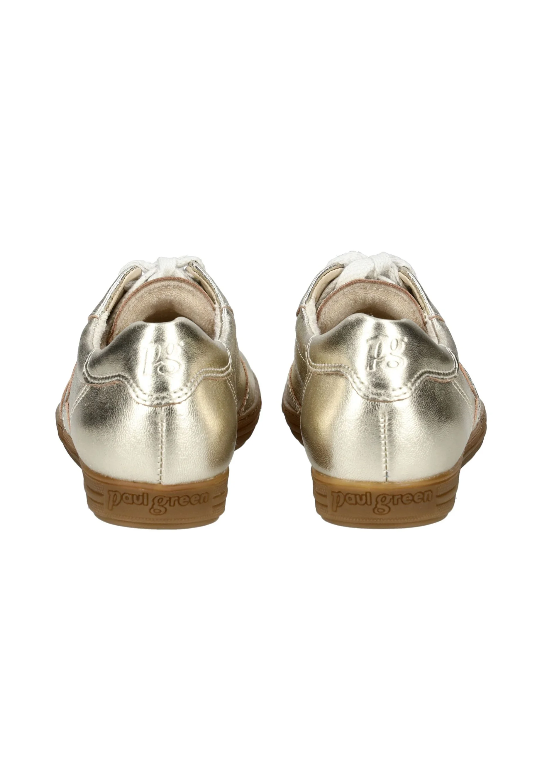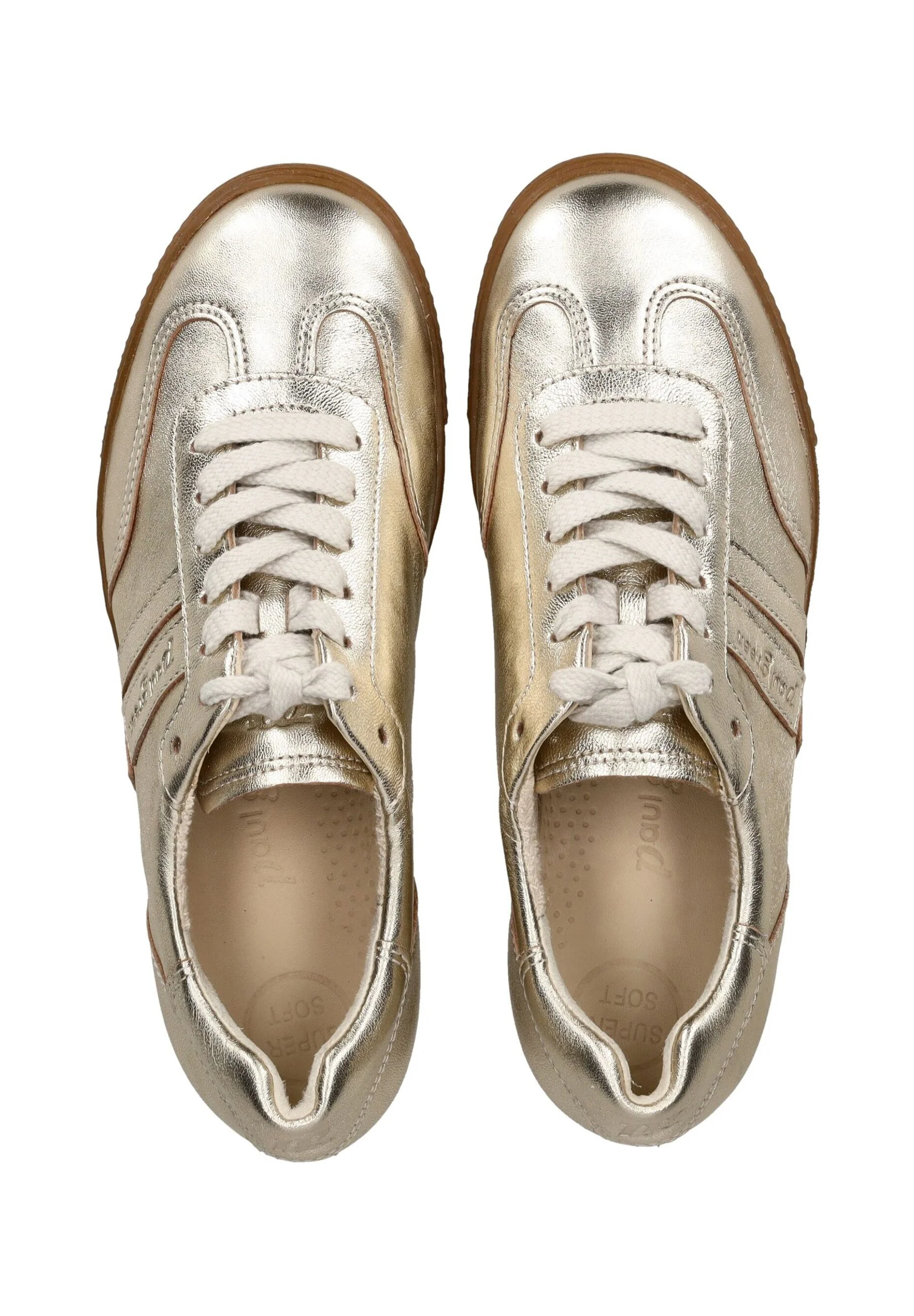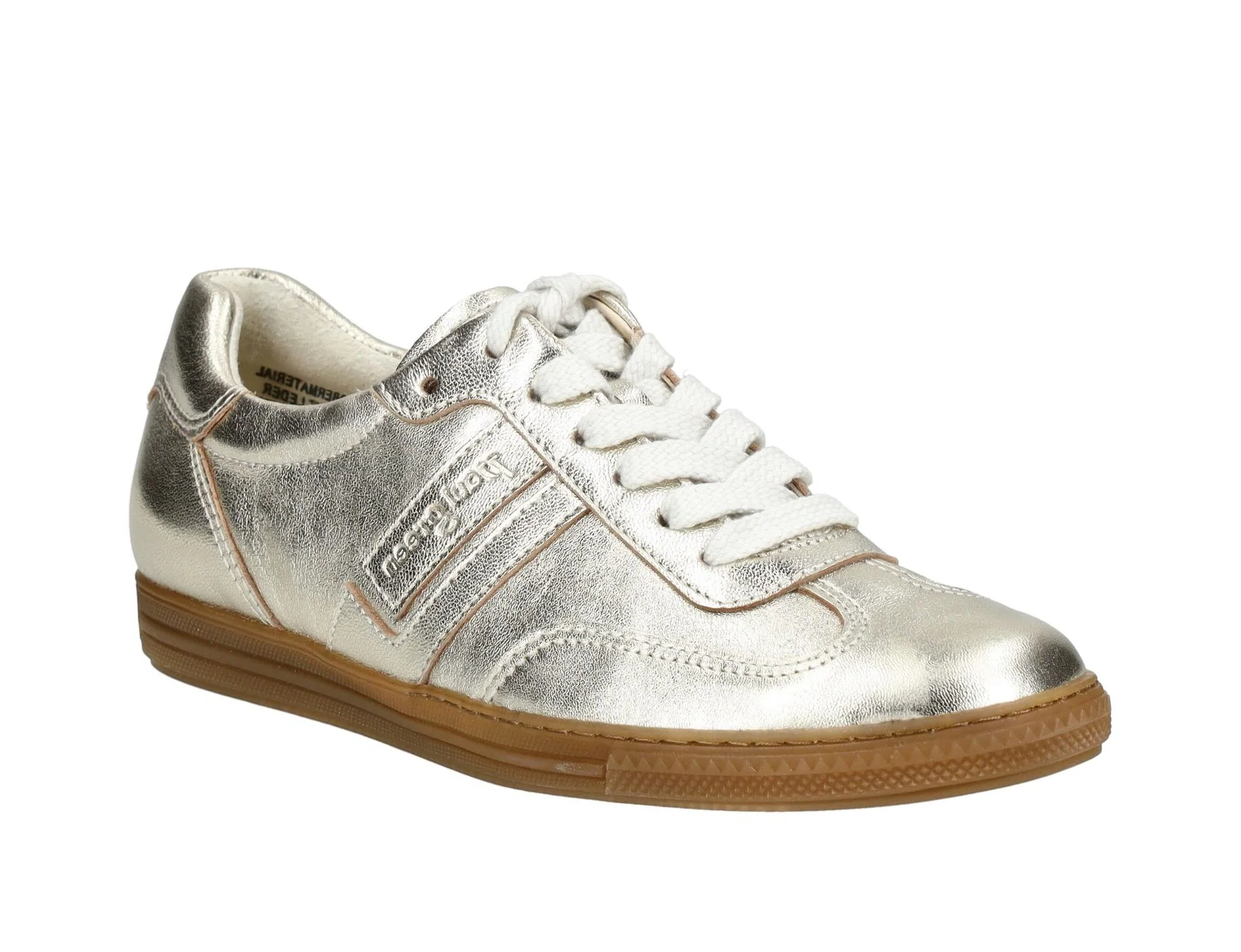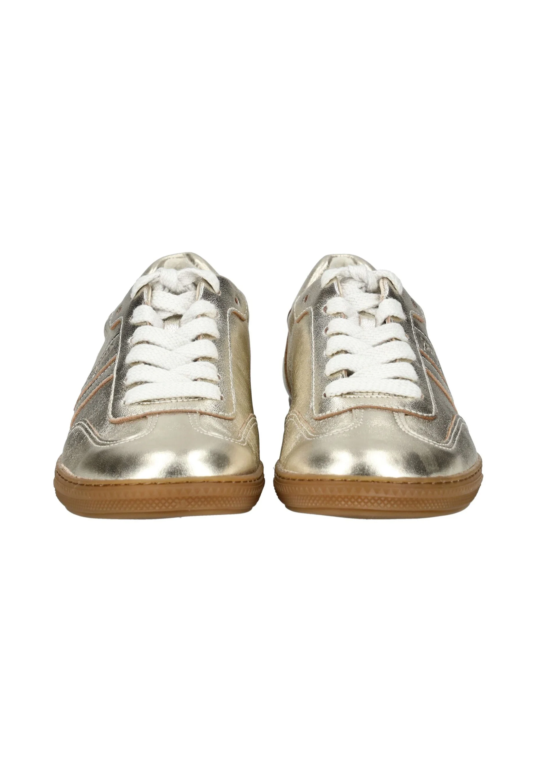 Sneakers i retro-stil i platinfarvet (guld og sølv) glat skind. Snørelukning. Indvendig er de skindforet i indersål og hælkap og et tyndt lag bomuldsfrotte i resten af skoen. lav sål på 2 cm i naturgummi. Superfin til både jeans, shorts og kjoler. Normal i str.
