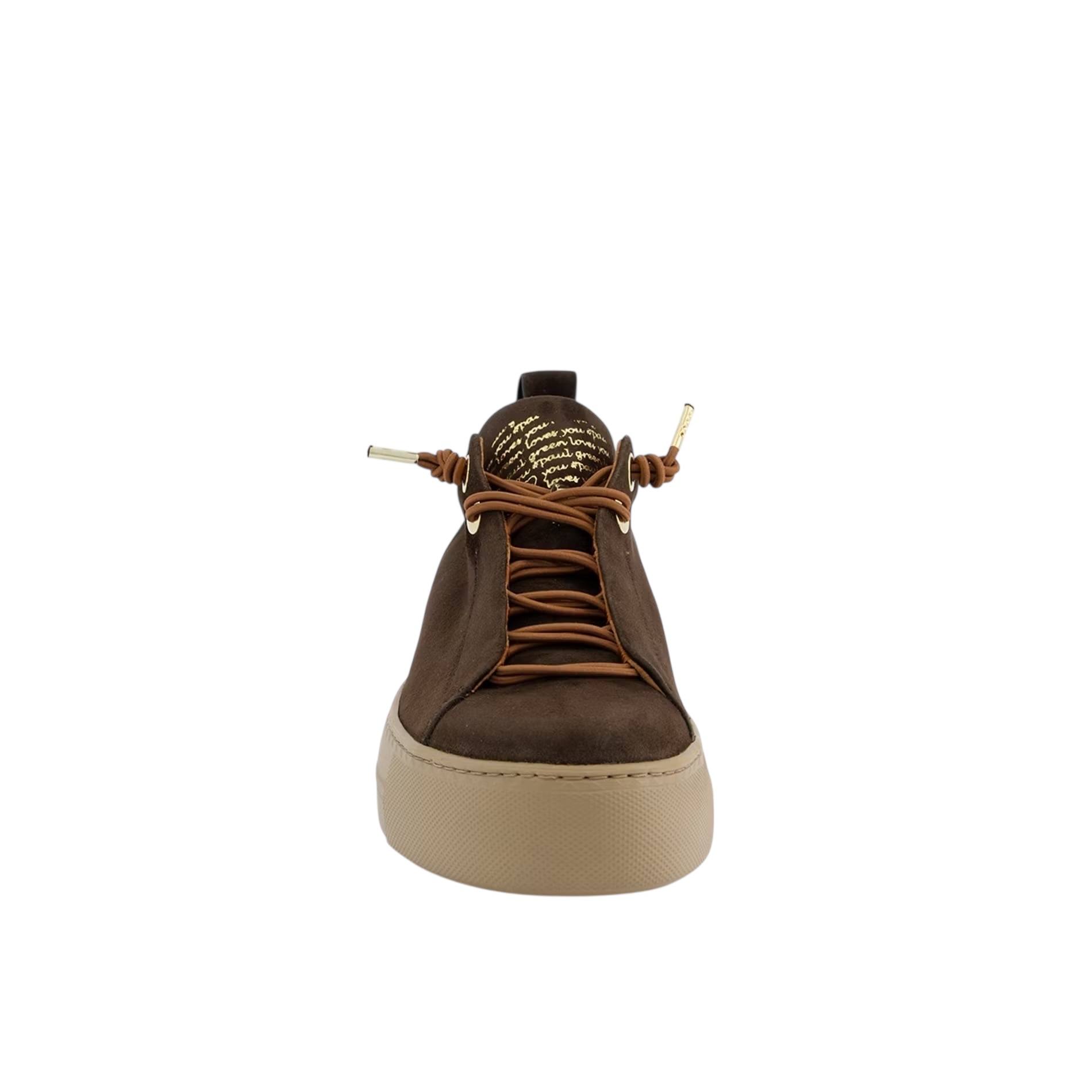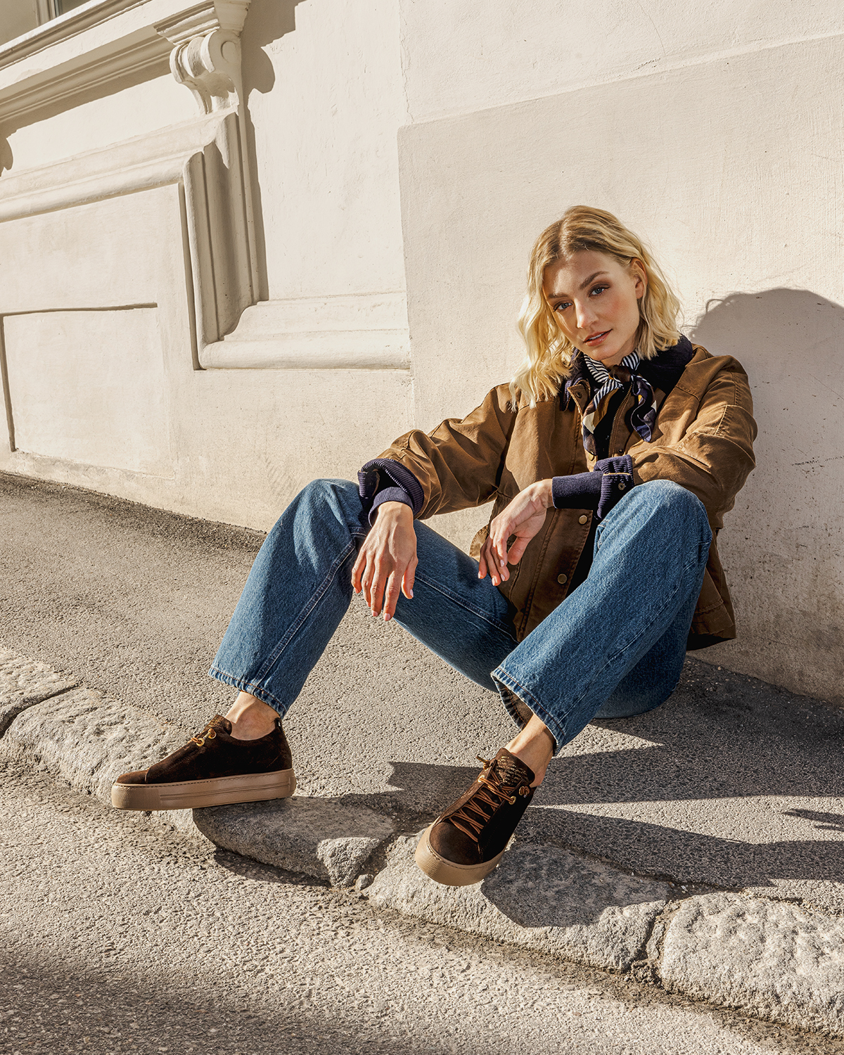 Smart sneakers fra Paul Green i en flot brun ruskind med elastik-snøre og guldtryk. Foret med det blødeste skind. Plateausåler på 3 cm i blød sandfarvet gummi. Dejlig pasform med god svangstøtte og lidt rummelig i str. , så tag dem et halvt nr. mindre end du plejer.