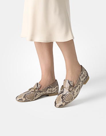 Klassisk håndlavet loafer fra Paul Green i slangeprinted skind med guldspænde. Skindforet. Bløde gummisåler med flad hæl. De sidder rigtigt flot da de går højt op af foden. Rummelige i str. og mange går et halvt nr. ned i str.