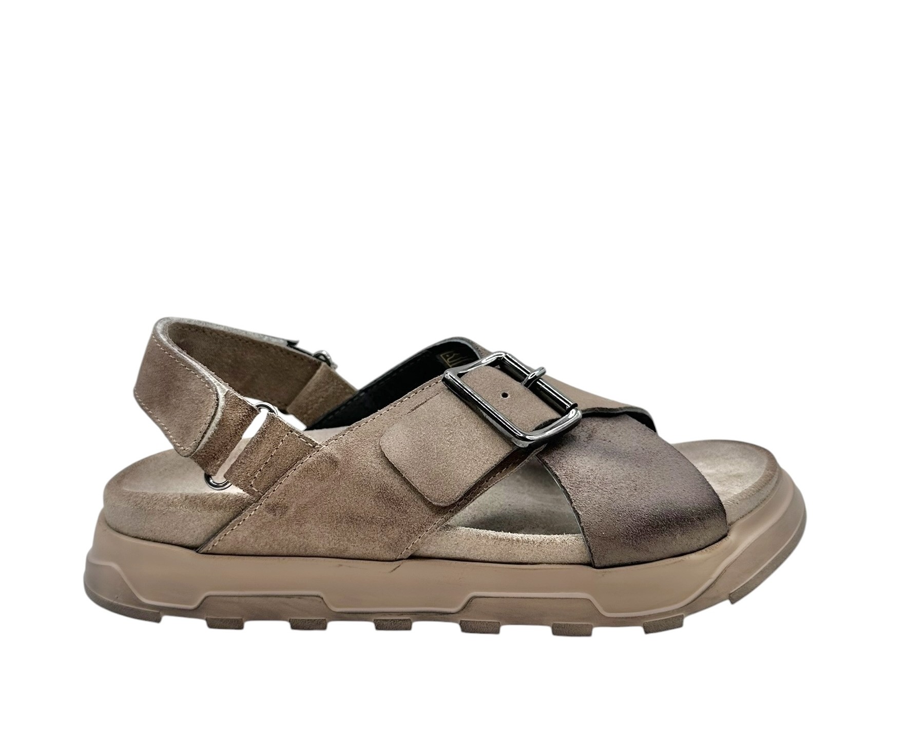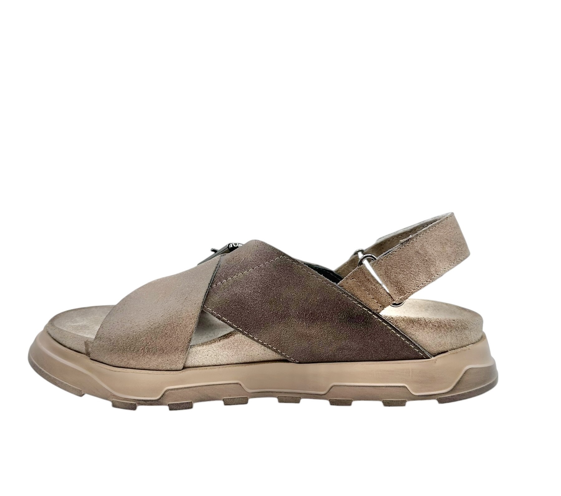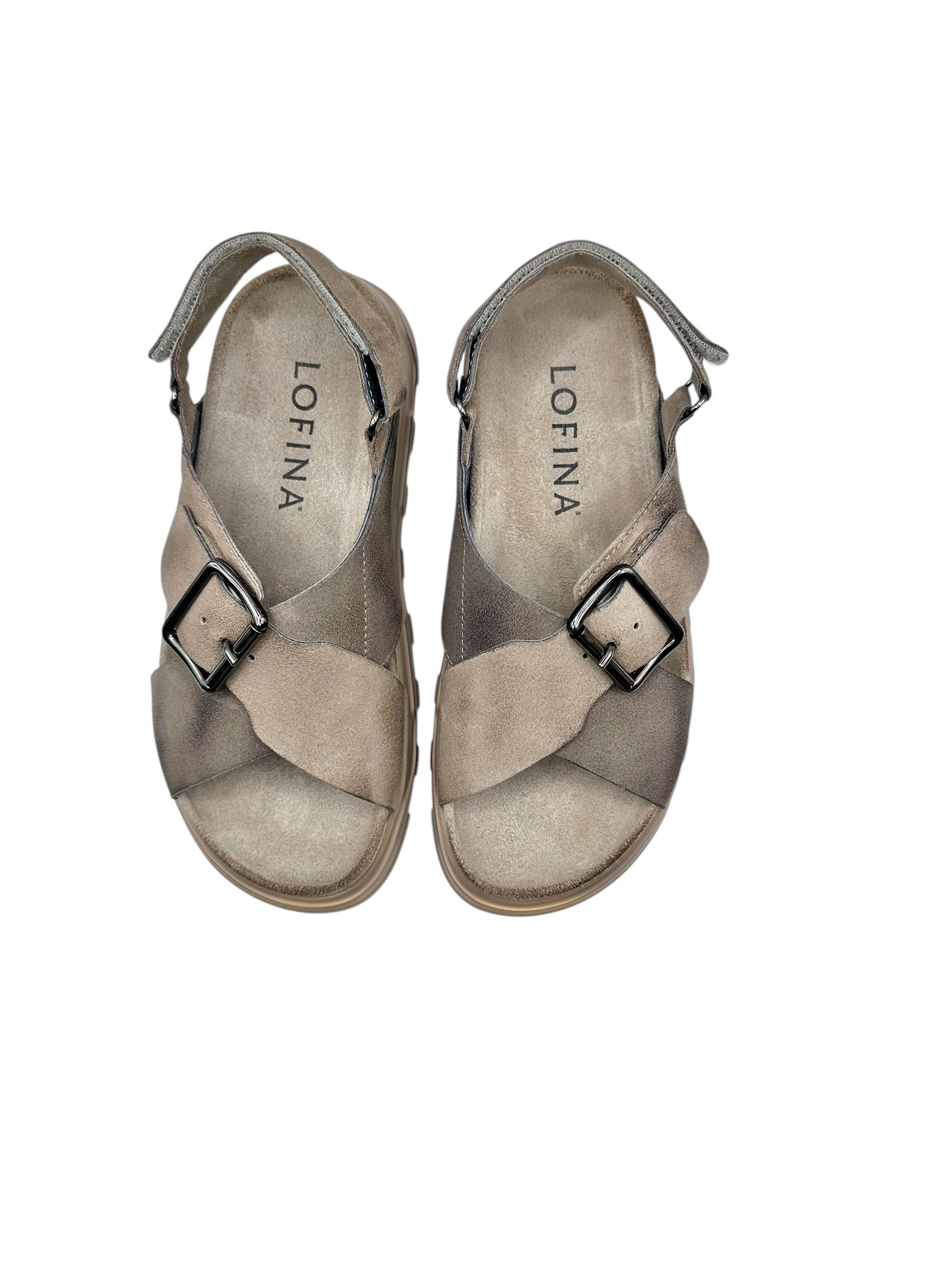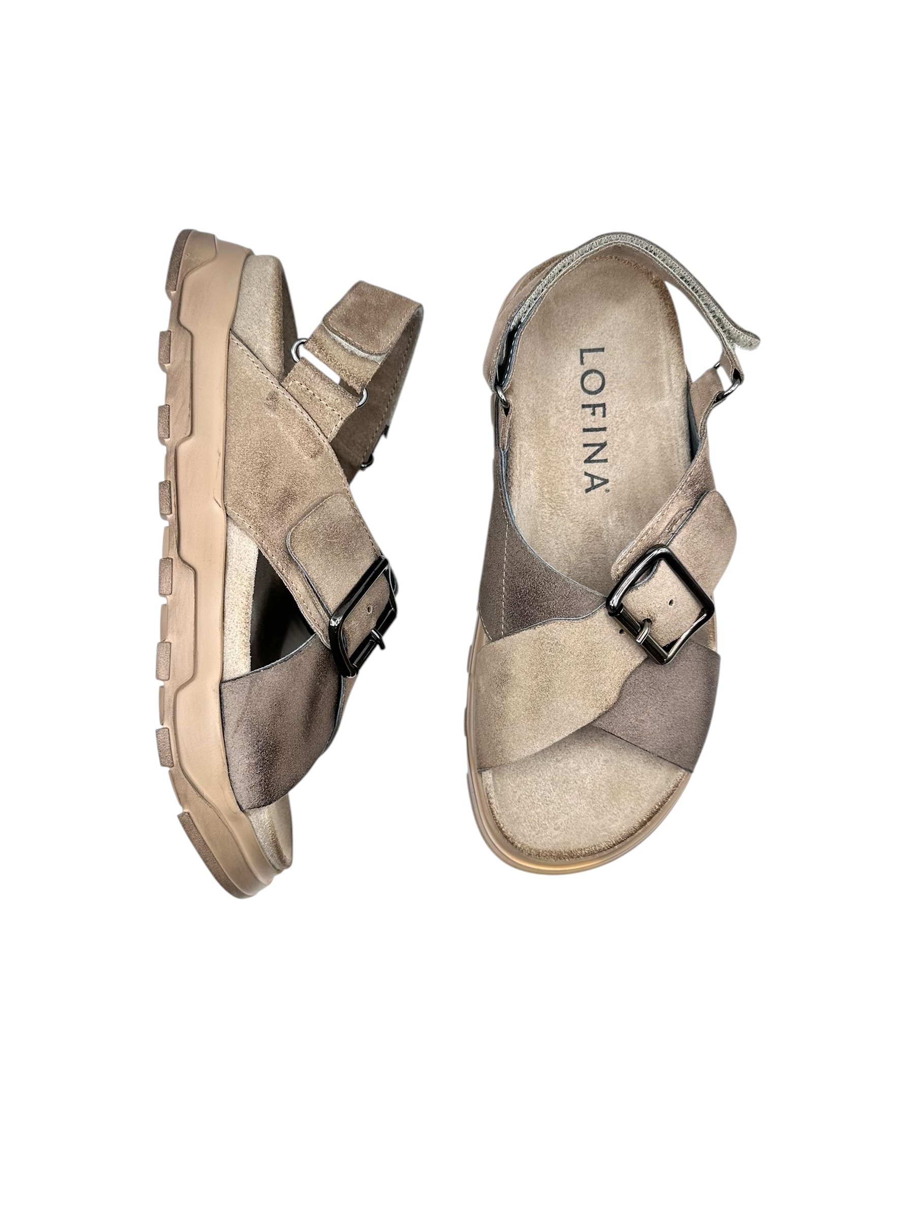 Smart ny slippers model fra danske Lofina i en gråbrun og beige ruskind med regulerbar hælrem og spænde. Indersål i blødt polstret ruskind med megen svangstøtte. Kraftig blød sål i beige gummi. Normal i str.