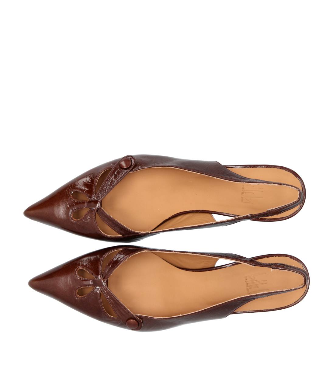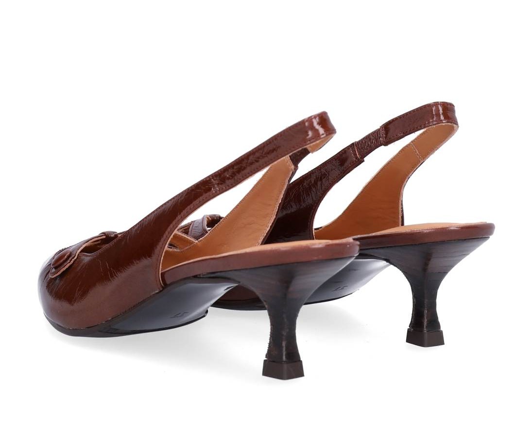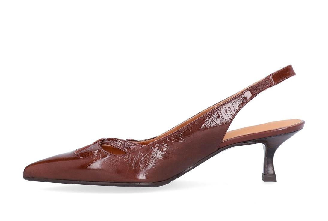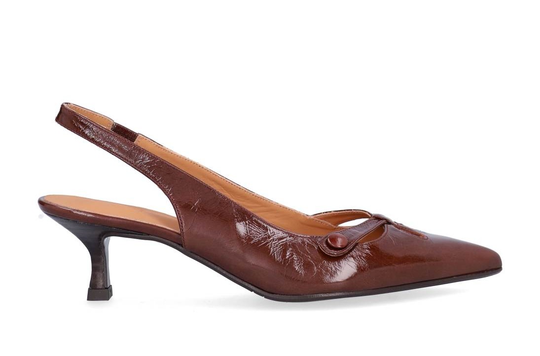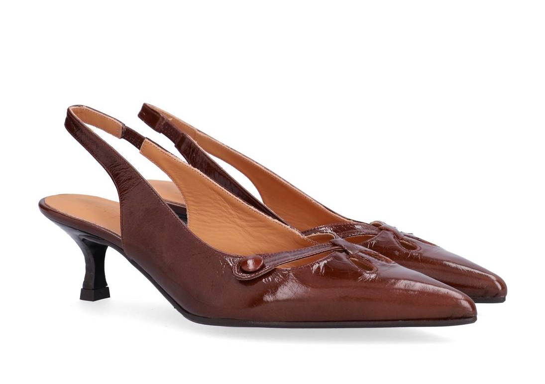 Elegant pumps fra Billi Bi med slingback i varm brun lakeret skind. Spids snude og fine hul-mønstre. Skoen har lille slank hæl i brun læderfiner på 4 cm. Skindforet. Gummisål. Normal i str. men passer bedst en smal/normal fodbredde,