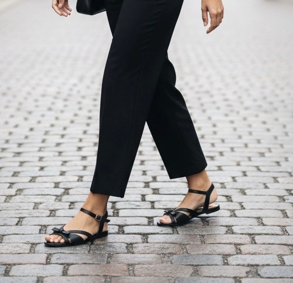 Håndlavet sandal fra danske Billi Bi, udført i sort glat skind med ankelrem. Foret med skind. Sandalen har tynde remme over forfoden med en lille flad sløjfe i skind. Gummisåler. Normal i str.