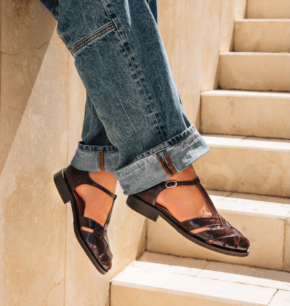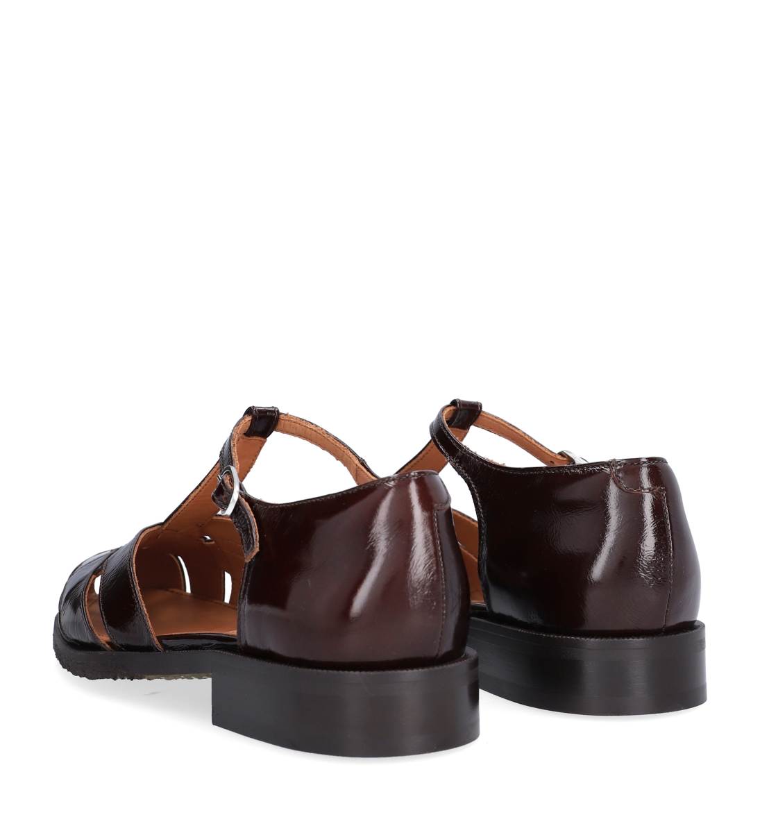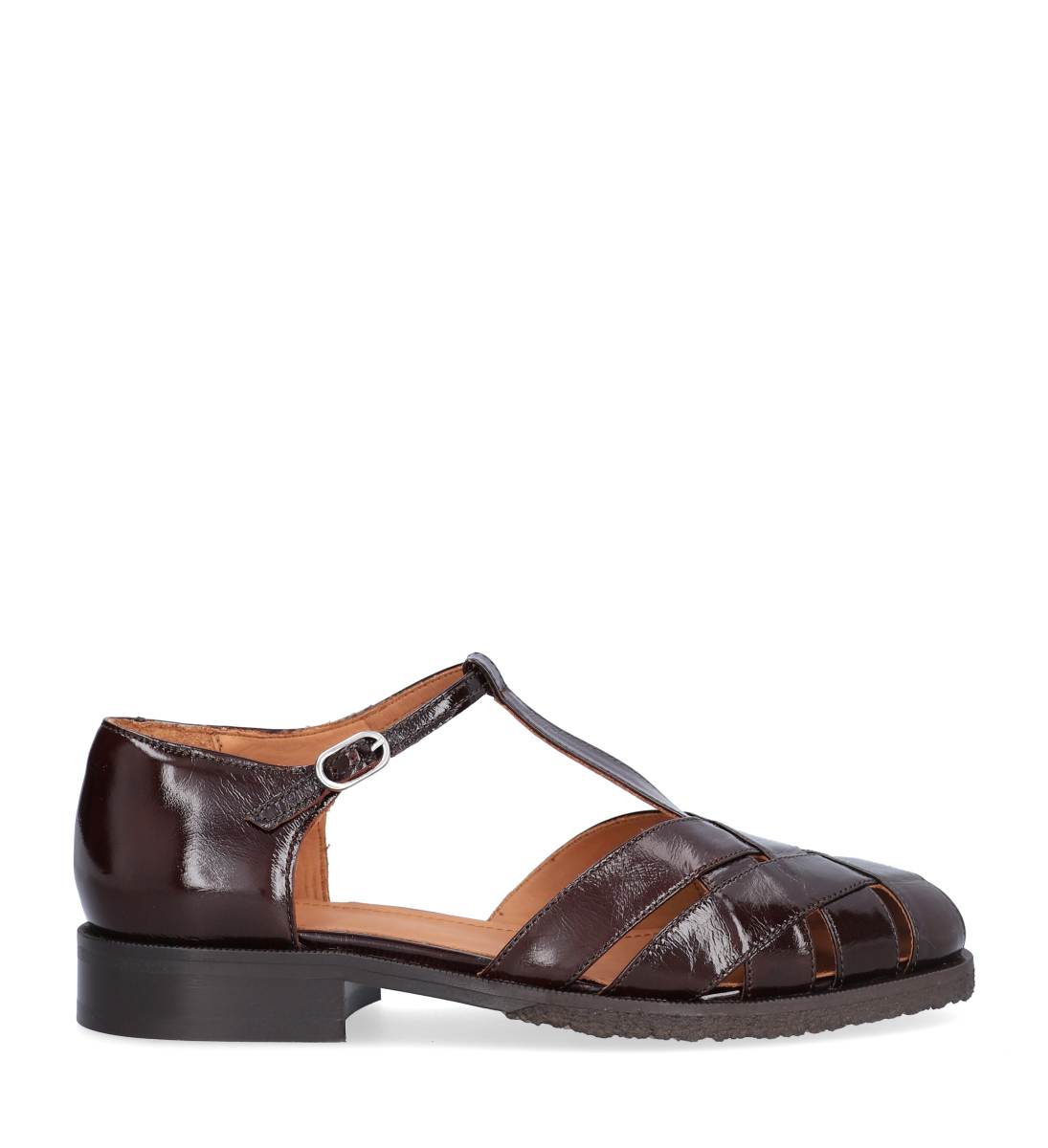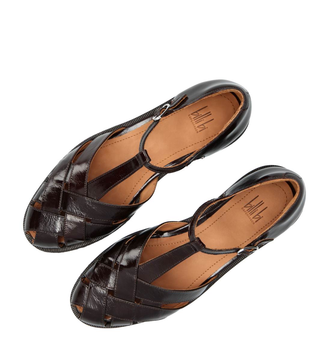 Håndlavet flad sandal fra Billi Bi, udført i lakeret brunt skind med rund tå. Sandalens front er konstrueret af remme, som er vævet ind mellem hinanden. Sandalen lukkes med et lille sølvfarvet spænde. Skindforet. Designet med lukket hælkappe og en blød rågummisål ved forfoden. Normal i str.