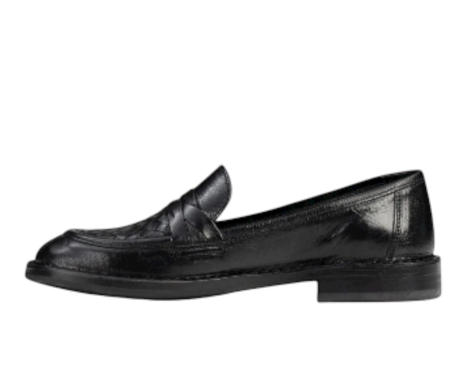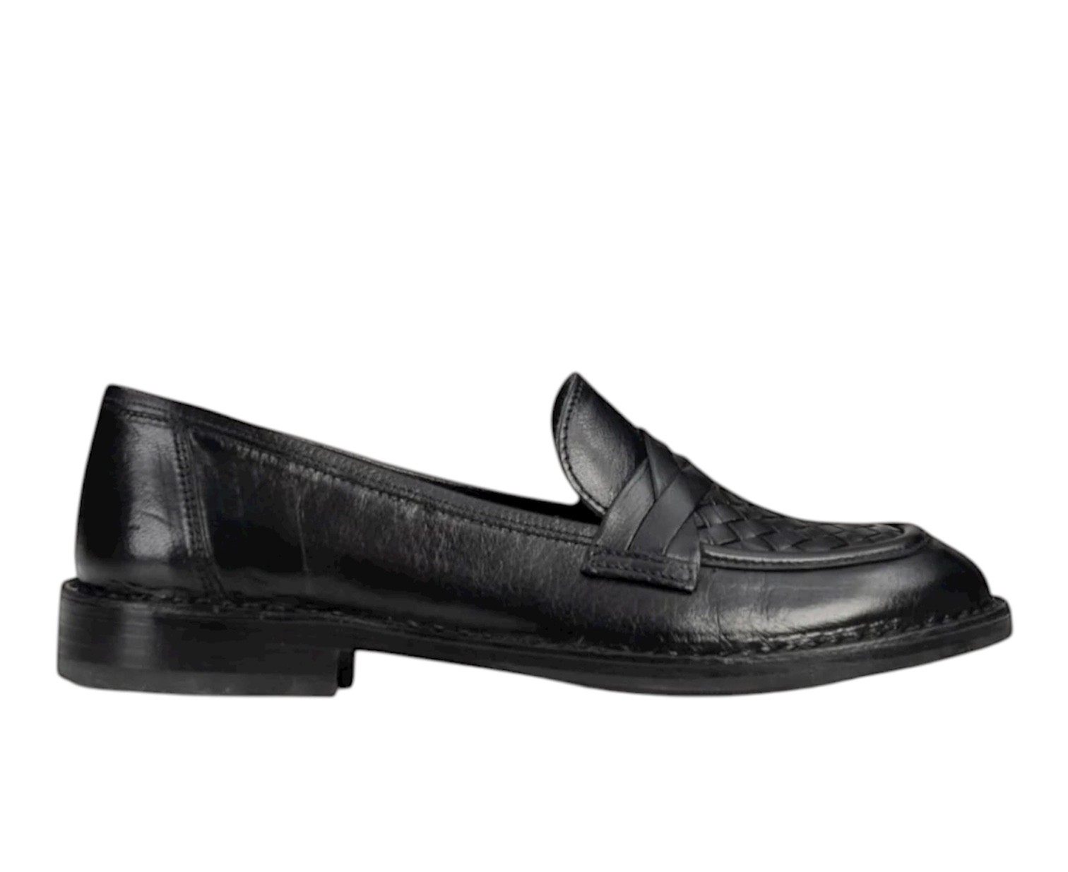 Flot sort dame loafer lavet i vegetabilsk garvet kalveskind. Skoen har dekorativt, flettet skind fortil og lavet på skindsål betrukket med en solid gummisål. Skøn komfort ! Normal i str.