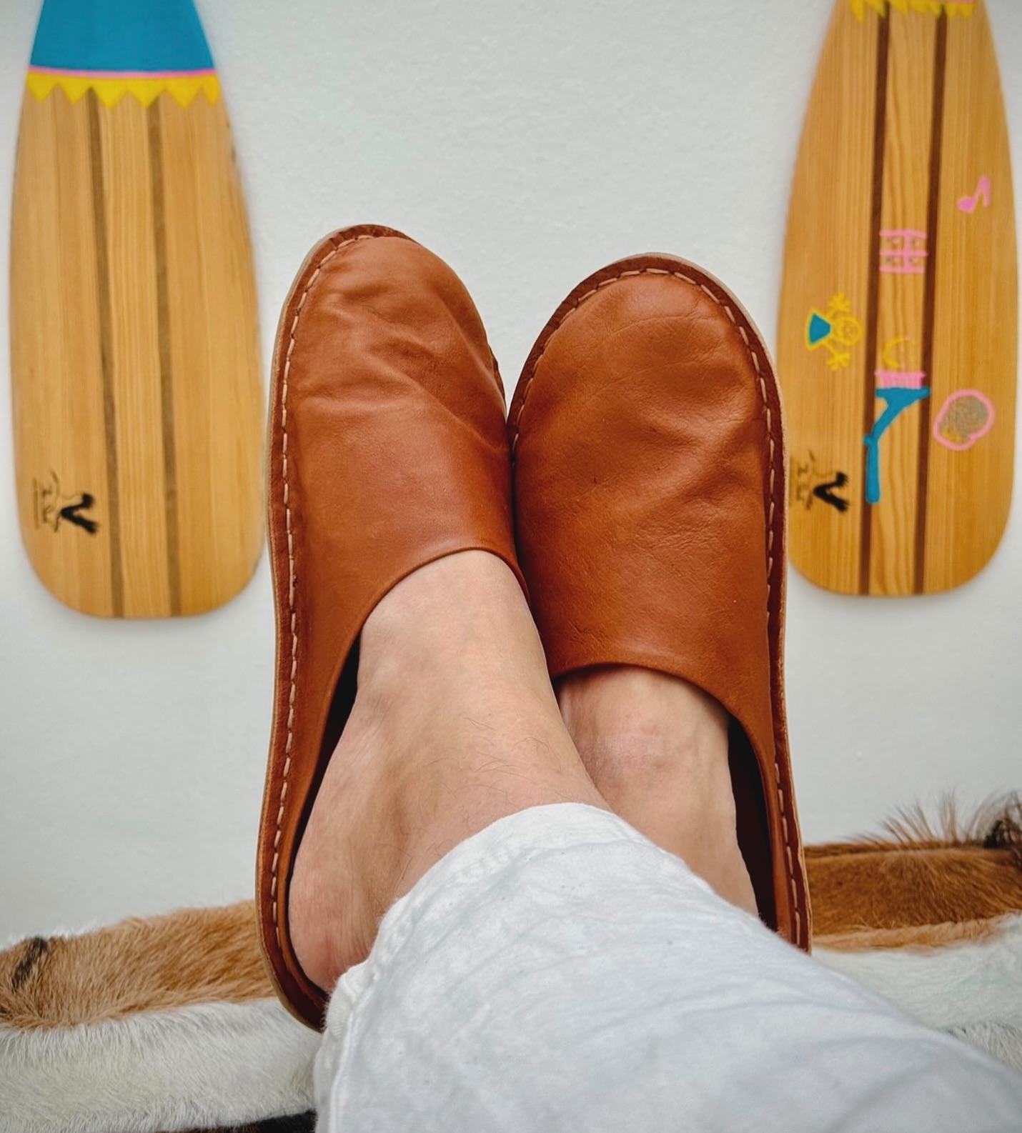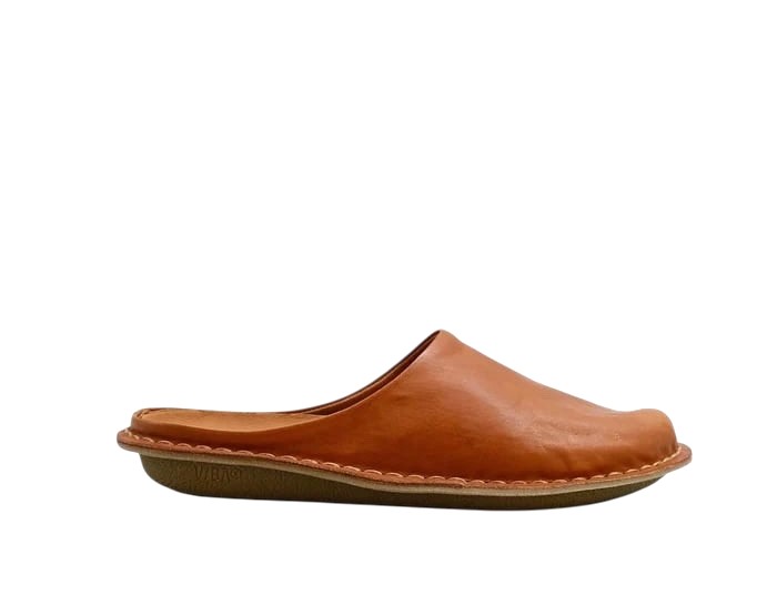Slippers fra VIBAe er finsk design og produceret i Portugal. Vegetabilsk garvet og blødt skind (kromfrit) i en flot cognac. Ydersålen er lavet af bæredygtigt naturgummi fra træer og er super fleksibel.