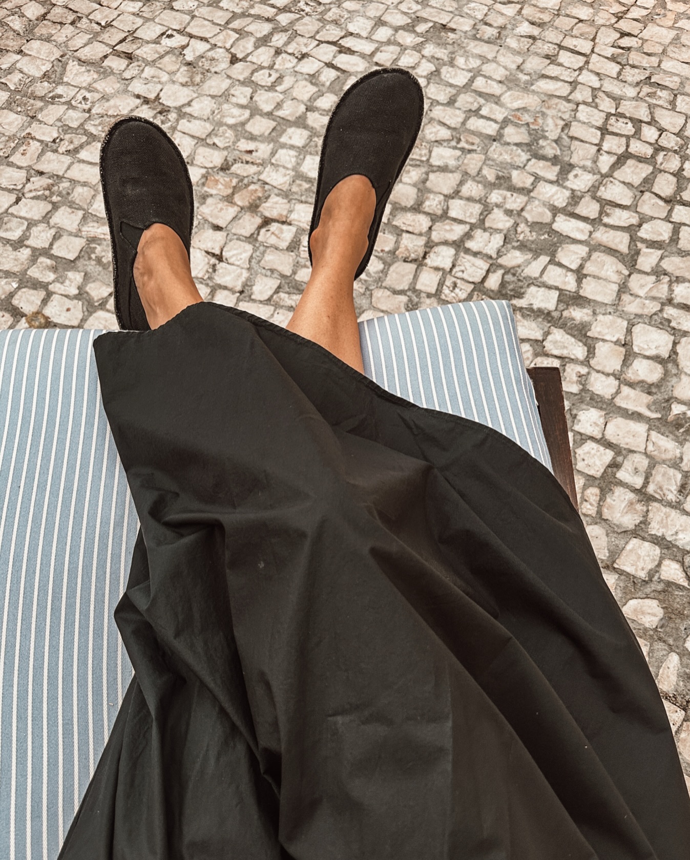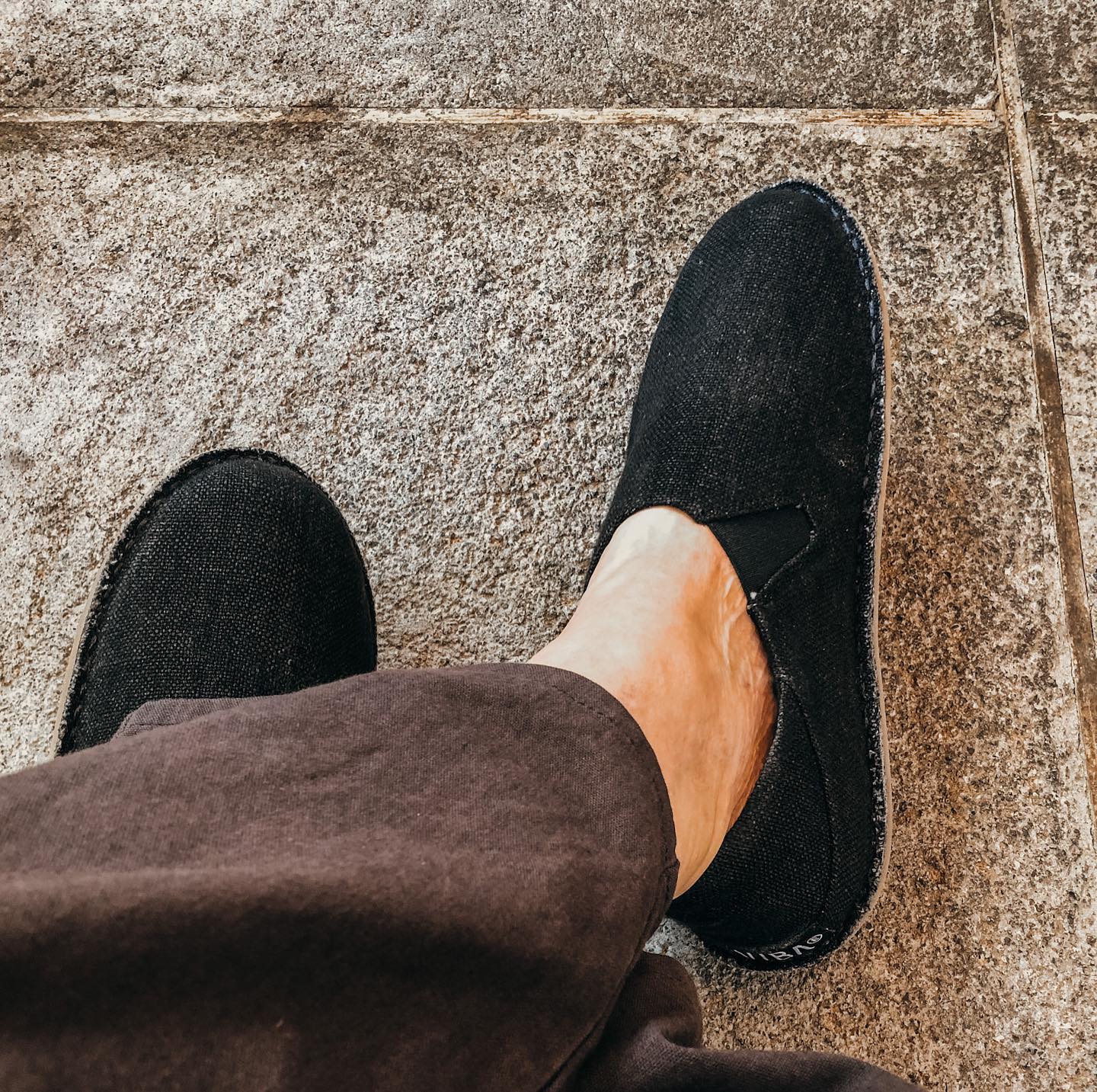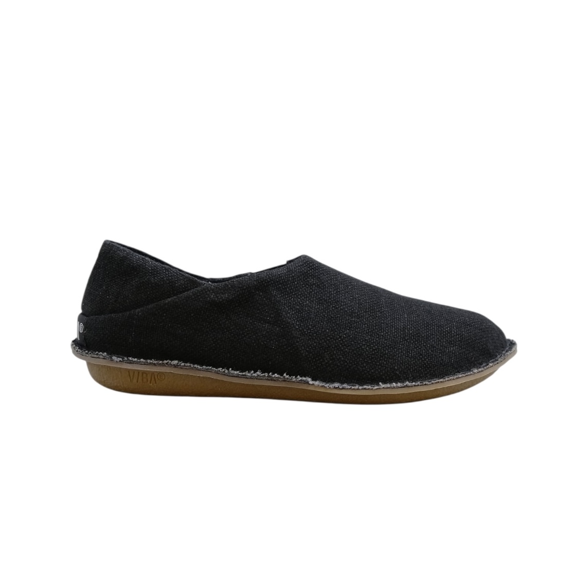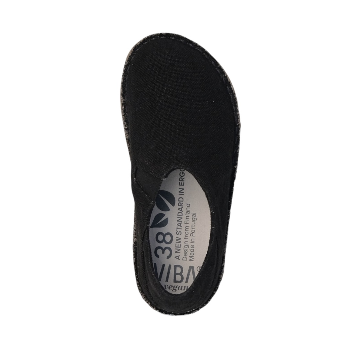 Sko eller slippers fra VIBAe som er finsk design og produceret i Portugal. Brug den som sko, eller træd hælkappen ned og brug den som en slippers. Den er lavet af vaskbar tekstil der er udvundet af hørfibre. Farven er sort. 100 % vegansk. Ydersålen er lavet af bæredygtigt naturgummi fra træer og er super fleksibel.