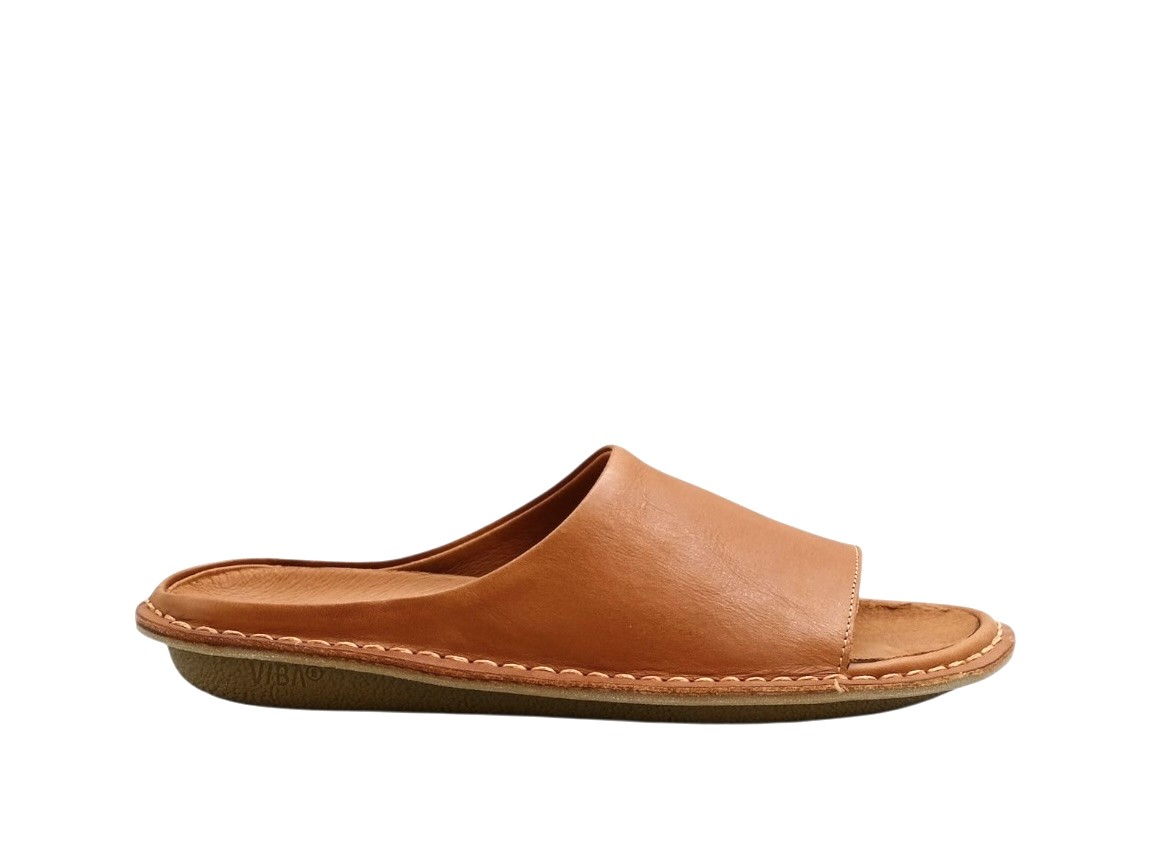 Slippers med åben tå fra VIBAe er finsk design og produceret i Portugal. Vegetabilsk garvet og blødt skind (kromfrit) i en flot cognac. Ydersålen er lavet af bæredygtigt naturgummi fra træer og er super fleksibel.