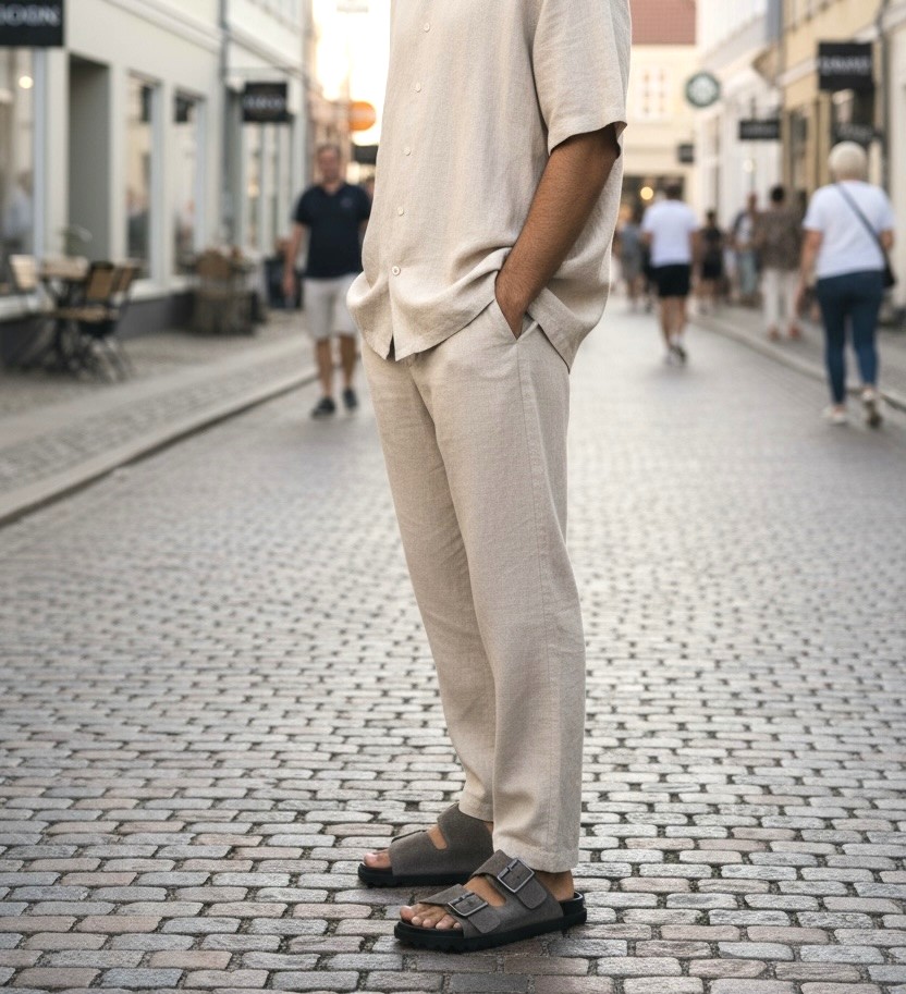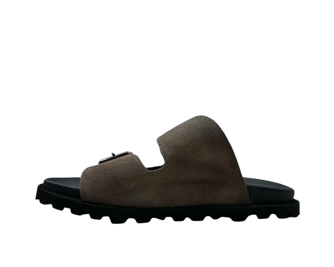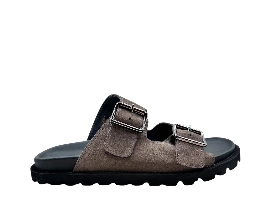 Slippers fra danske Lofina i gråbrunt ruskind med patina og regulerbare spænder. Indersåler i skind med god svangstøtte. Blød gummisål. Normal i str.